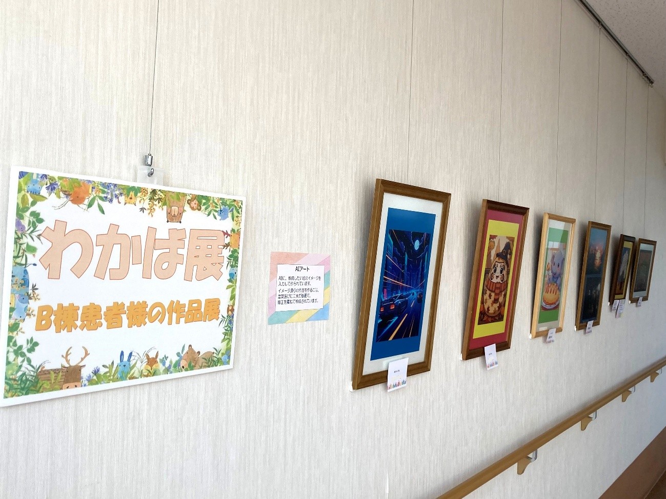 A棟廊下の院内ギャラリーにて、B棟(旧わかば病棟)の患者様の作品を展示しています。