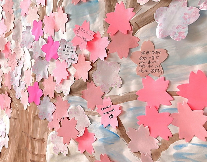 はじめは枝だけの桜の木でしたが、皆様に花を一枚一枚つけていただき、